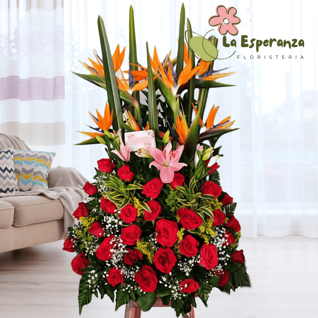 Ramo floral con rosas rojas y flores tropicales, ideal para cualquier ocasión especial en Valencia.