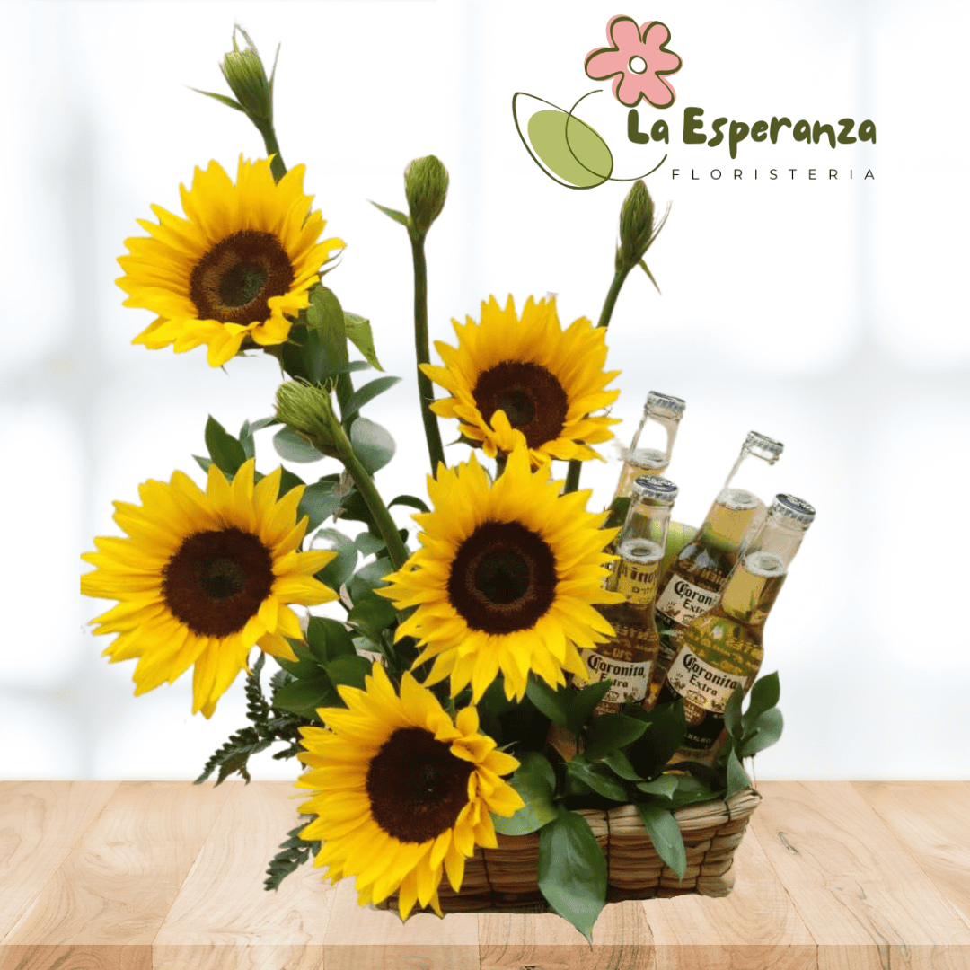 A ellos también les encanta recibir flores… a través de este lindo diseño puedes expresar tus sentimientos hacia ese hombre especial en tu vida, sobre una base de madera se ubican 5 girasoles, rosas, follajes verdes y 4 cervezas. Sugerimos que acompañes este diseño con chocolates, peluches o vinos para hacer aún más especial tu detalle, en el siguiente paso de la compra puedes agregar a tu orden estos productos si lo deseas.