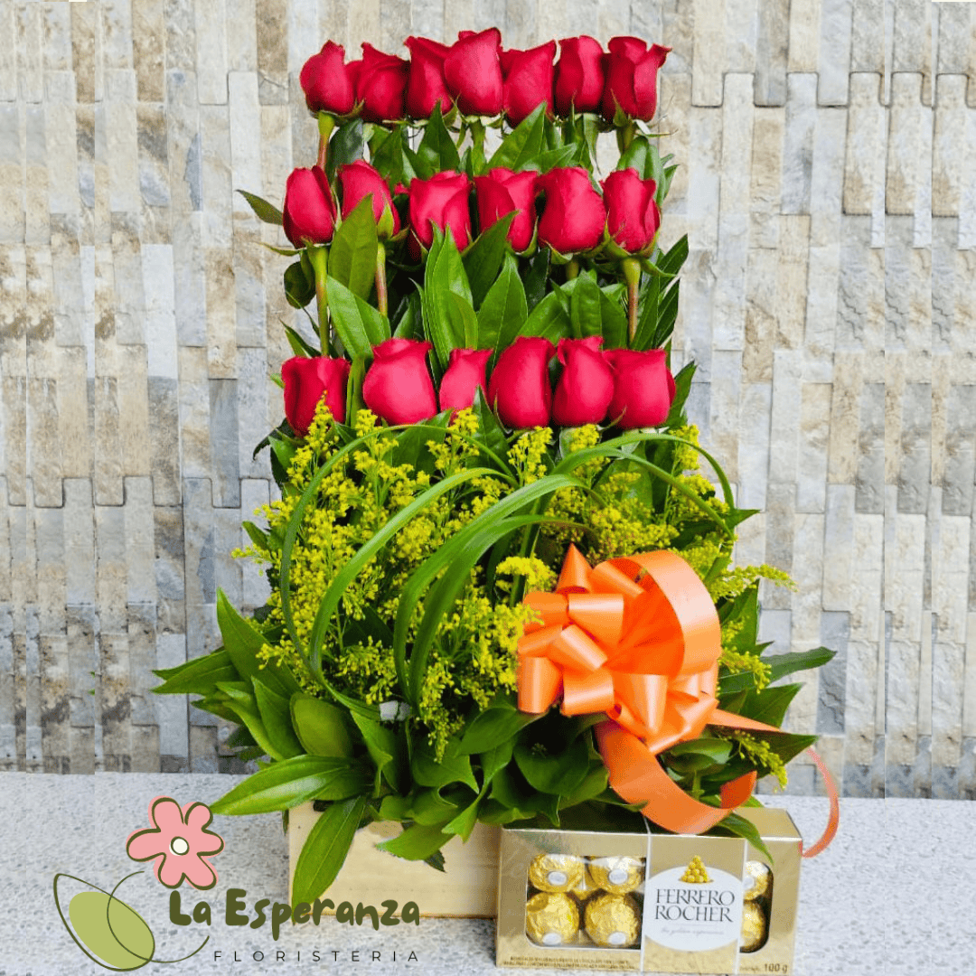Cuando se ama a una persona se hace hasta lo imposible por conquistar su corazón, regala este hermoso arreglo floral y demuestra todo tu afecto, este diseño se ha elaborado en una base bambú o madera con 18 rosas rojas y follajes verdes. El diseño incluye una caja de chocolates Ferrero Rocher por 8 unidades. Sugerimos que acompañes este diseño con chocolates, peluches o vinos para hacer aún más especial tu detalle, en el siguiente paso de la compra puedes agregar a tu orden estos productos si lo deseas.
