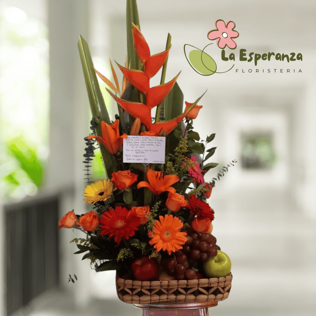 Flores y frutas en arreglo floral colorido, ideal para ocasiones especiales y regalos personalizados.