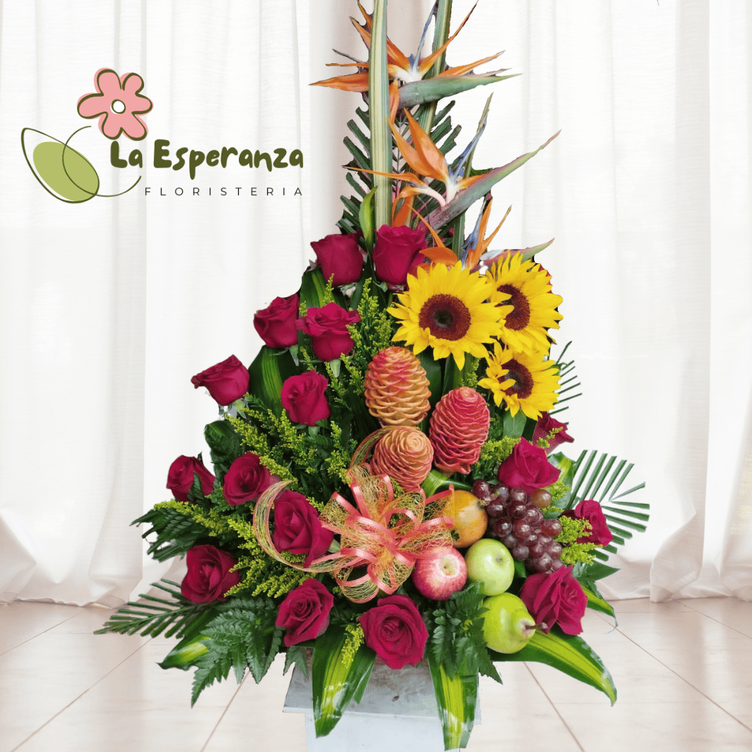 No necesitas una ocasión especial para regalar flores. Sorprende a esa persona especial con este hermoso diseño floral, elaborado sobre una base de mimbre o madera, que incluye rosas, gerberas, lirios, follaje verde y frutas tropicales frescas. Para hacer tu gesto aún más significativo, te sugerimos acompañar este arreglo con chocolates, peluches o vinos. En el siguiente paso de la compra, podrás añadir estos productos a tu pedido si lo deseas.