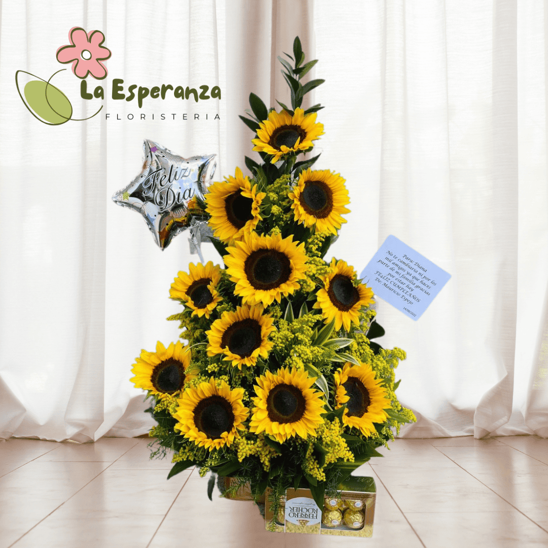 Los girasoles expresan alegría y felicidad, que puede ser mejor entonces que enviar a ese ser querido este lindo diseño, se encuentra elaborado sobre una base de madera rústica y se compone de 11 girasoles y follajes verdes, 1 caja de chocolates Ferrero Rocher x 8 unidades y un globo metalizado de «Feliz día». Es ideal para cualquier ocasión. Sugerimos que acompañes este diseño con chocolates, peluches o vinos para hacer aún más especial tu detalle, en el siguiente paso de la compra puedes agregar a tu orden estos productos si lo deseas.