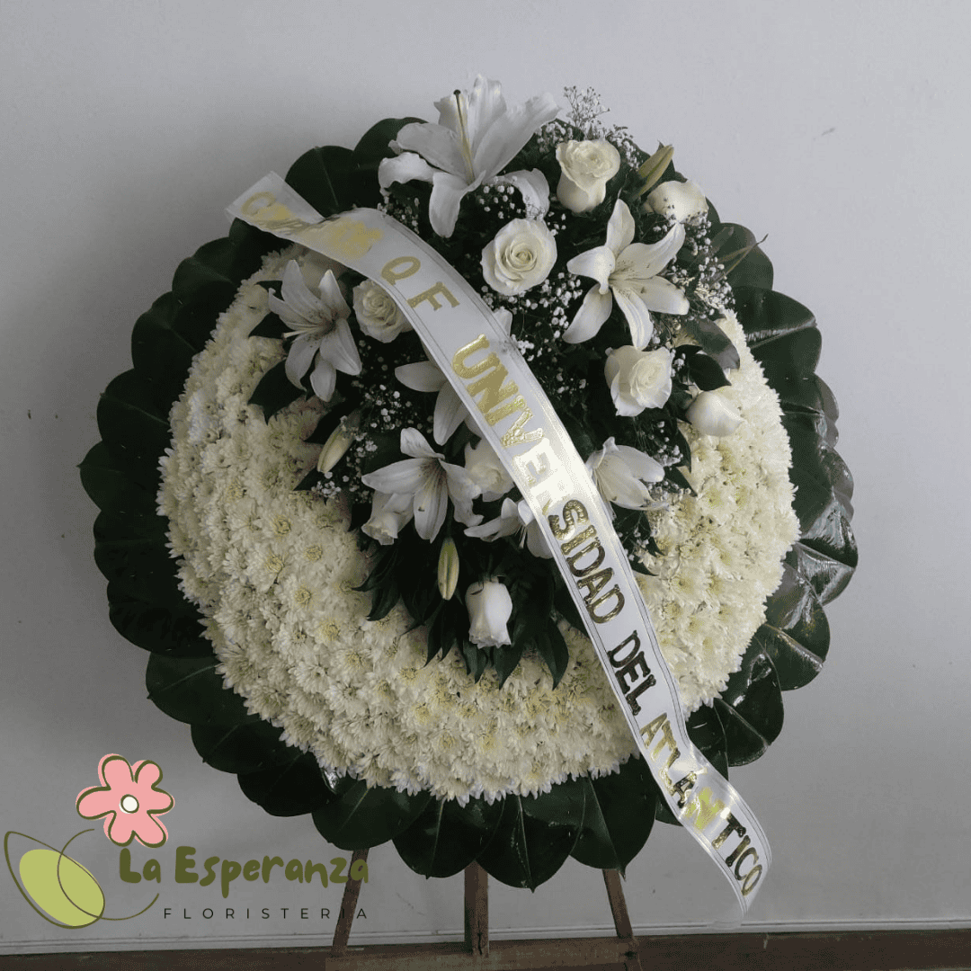 Envía un mensaje de aliento y expresa tus condolencias a los familiares de ese ser fallecido, por medio de esta hermosa corona fúnebre que esta elaborada con margaritas o pompones y aplique con 18 rosas blancas, azucenas o lirios blancos y follajes verdes.