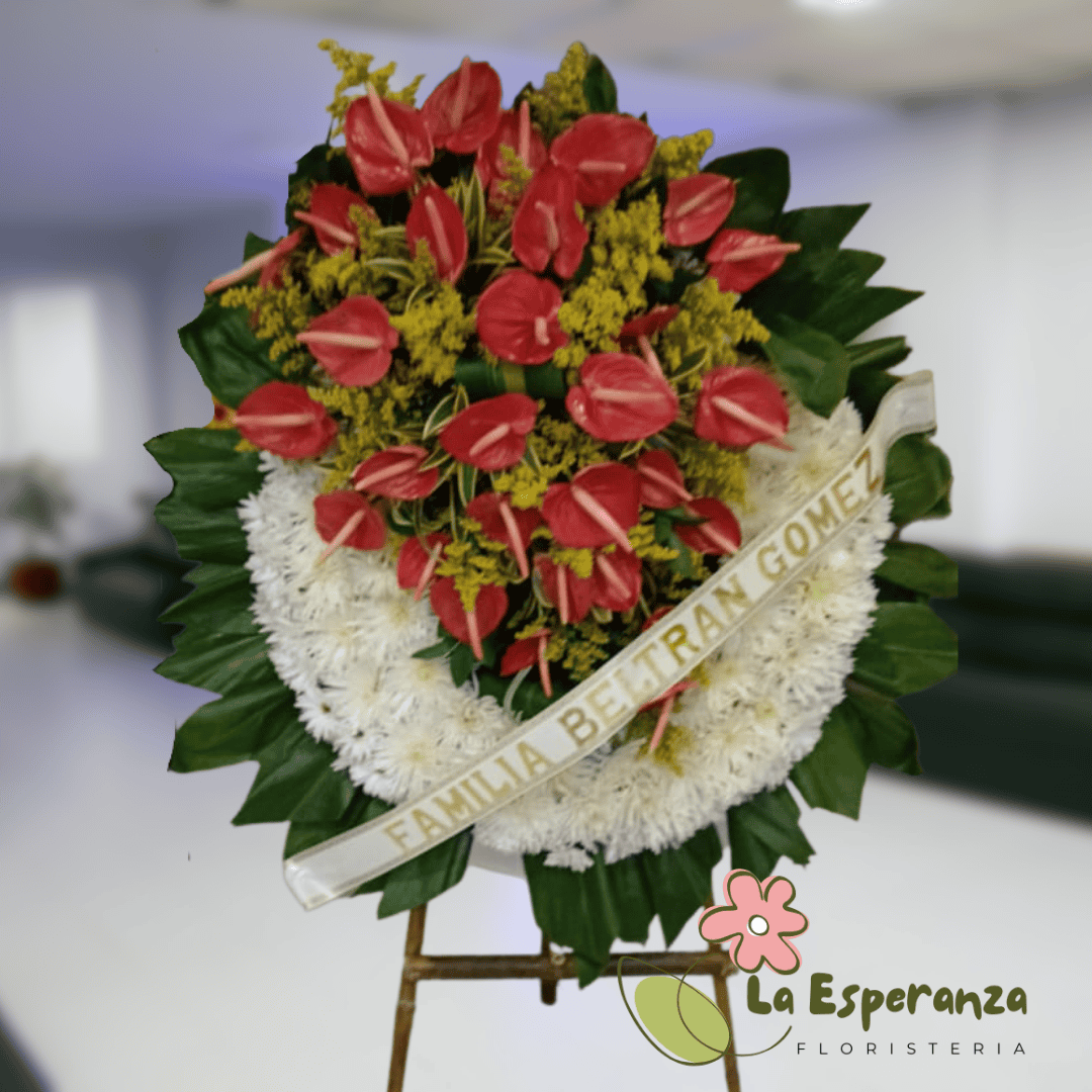Expresa tus más sentidas condolencias a los familiares de ese ser que ha fallecido, enviado esta hermosa corona fúnebre, esta elaborada con fuyi o crisantemos blancos y aplique con anturios rojos y follajes verdes.