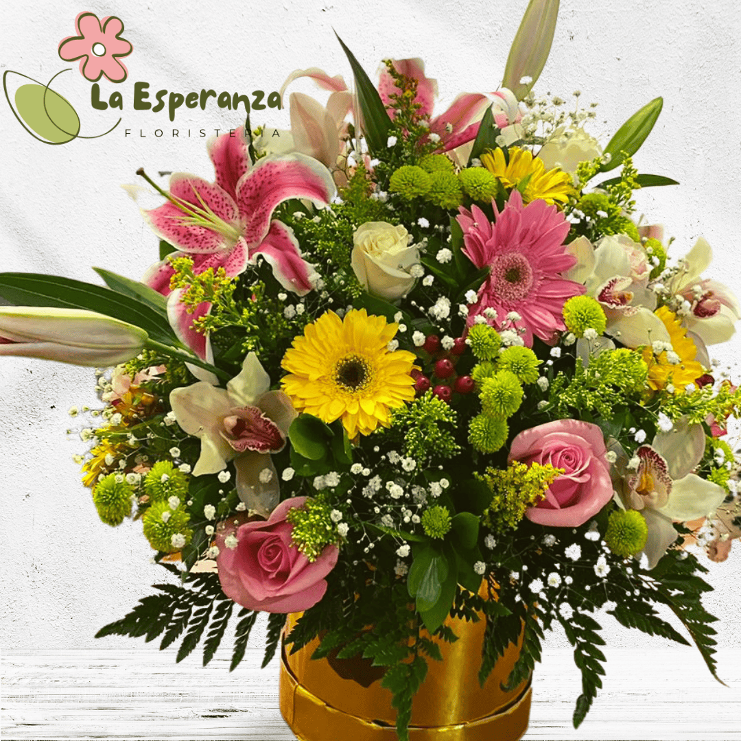 Ramo de flores frescas con gerberas, rosas, lirios y más en un florero dorado. Ideal para ocasiones especiales y regalos.