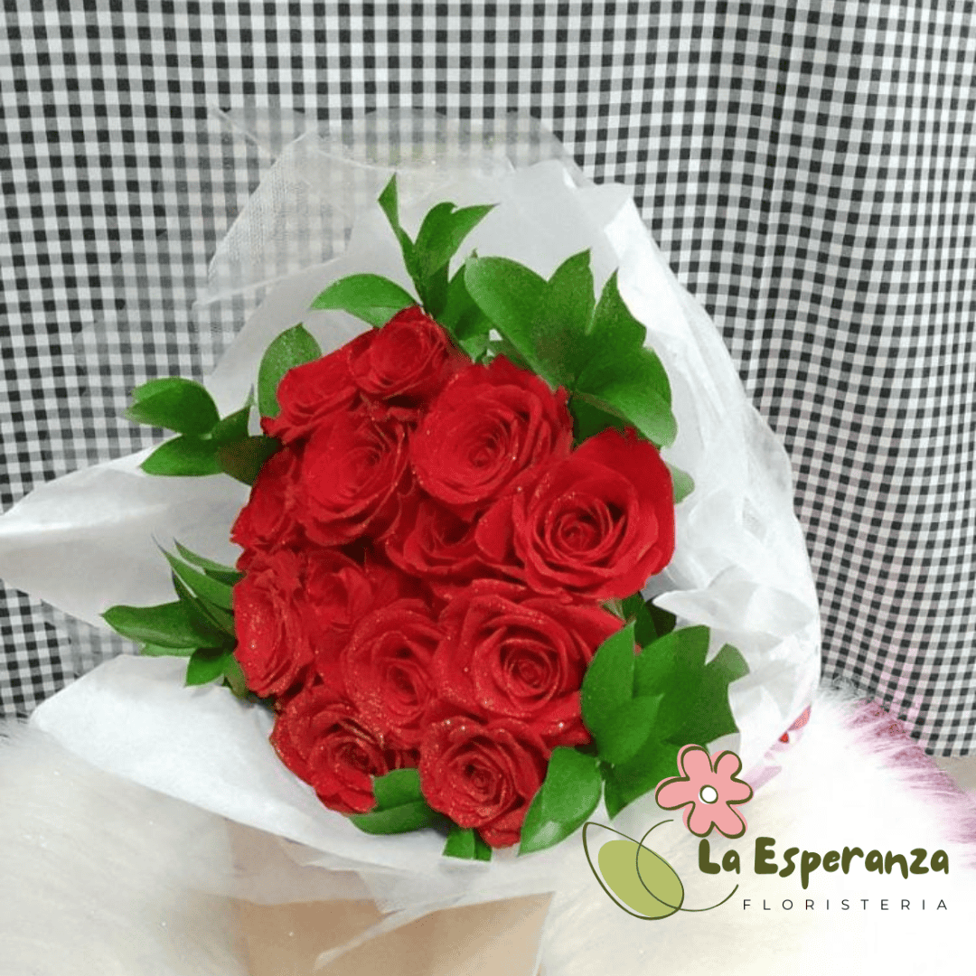 Ilumina su día con un elegante ramillete de 15 rosas, acompañado de exuberante follaje verde, cuidadosamente envuelto en papel coreano  y adornado con un lazo.